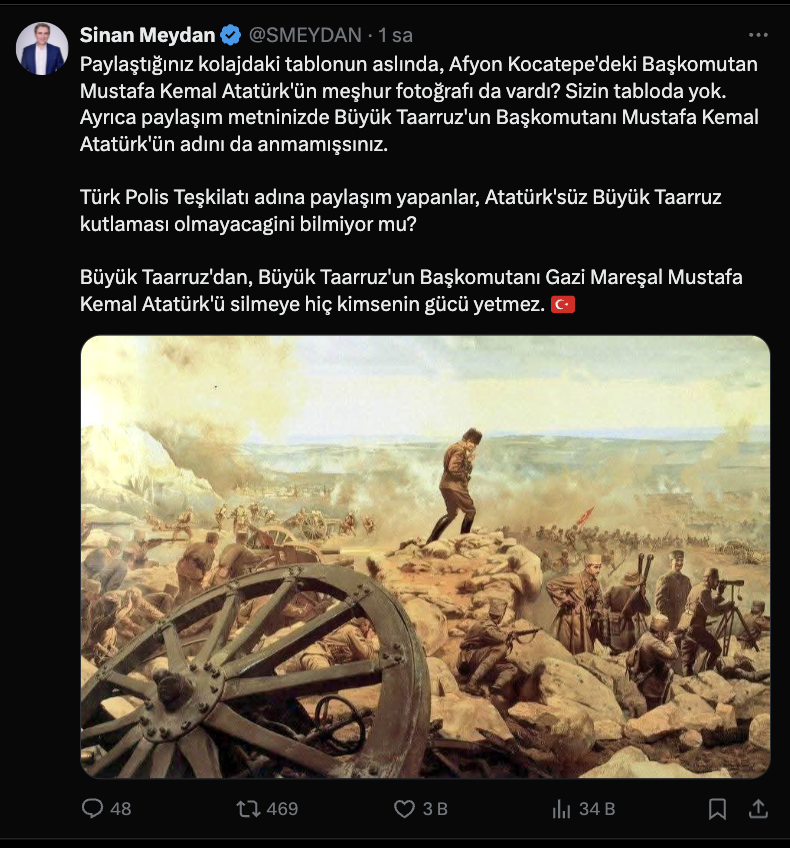 Tarihçi Sinan Meydan, ilgili paylaşıma yanıt vererek, “Paylaştığınız kolajdaki tablonun aslında Afyon Kocatepe’deki Başkomutan Mustafa Kemal Atatürk’ün meşhur fotoğrafı da vardı. Sizin tabloda yok. Ayrıca paylaşım metninizde Büyük Taarruz’un Başkomutanı Mustafa Kemal Atatürk’ün adını da anmamışsınız. Atatürk’süz Büyük Taarruz kutlaması olmaz” dedi.