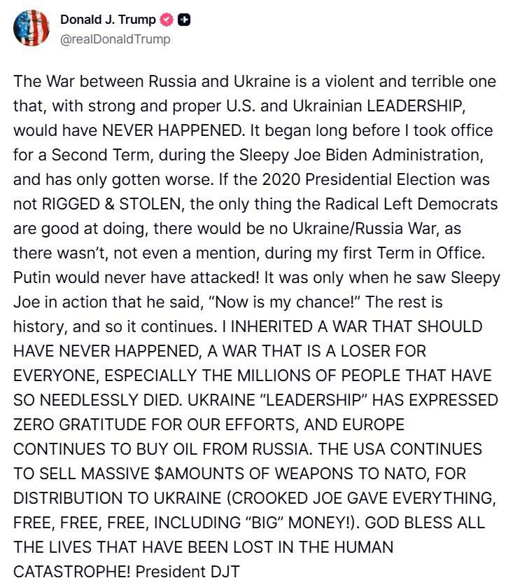 Trump, “Rusya ve Ukrayna arasındaki savaş, güçlü ve düzgün bir ABD ve Ukrayna liderliği olsaydı asla olmazdı” diyerek, “Asla olmaması gereken, herkesin kaybettiği, özellikle gereksiz yere milyonlarca insanın öldüğü bir savaşı miras aldım.” şeklinde konuştu. Trump ayrıca, “Ukrayna liderliği çabalarımız için hiçbir minnet duymadı.” ifadelerini kullandı.